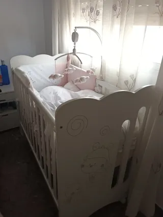 Cuna madera con ruedas + colchón + ropa