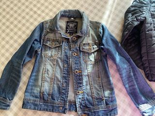 Conjunto de ropa infantil que incluye: - Chaqueta vaquera de manga larga Kiabi talla 122cm. - chaqueta acolchada ligera talla 128cm. - Vaqueros negros Kiabi talla 122cm. - 2 sudaderas con cremallera de Benetton talla 5 años (gris), 6 años (roja). - 2 sudaderas con capucha y otra sin talla 5 años. - 1 forro polar decathlon talla 5-6 años - 4 camisetas manga larga talla 5 años.
