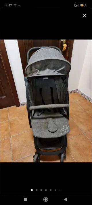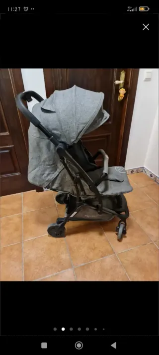 Silla de paseo ligera y compacta, ideal para el día a día y viajes, incluso en avión. - Fibra de carbono. A penas pesa. Ligera y compacta. - Diseño moderno en color gris. - Capota extensible. - Barra de seguridad. - Arnés de 5 puntos. Medidas cerrado aproximadamente: 48x33x56