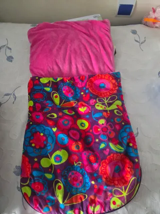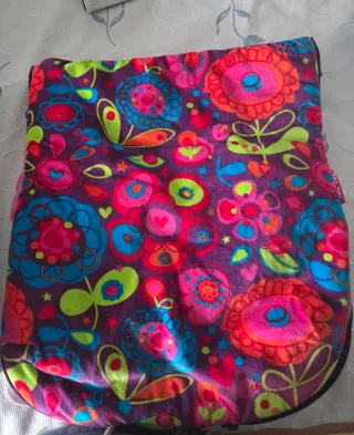 Saco para silla de paseo de bebé con un alegre y colorido estampado floral sobre fondo morado. La parte superior es de un suave tejido rosa. - Estampado floral vibrante. - Suave tejido rosa en la parte superior. - Diseño Tuc Tuc.