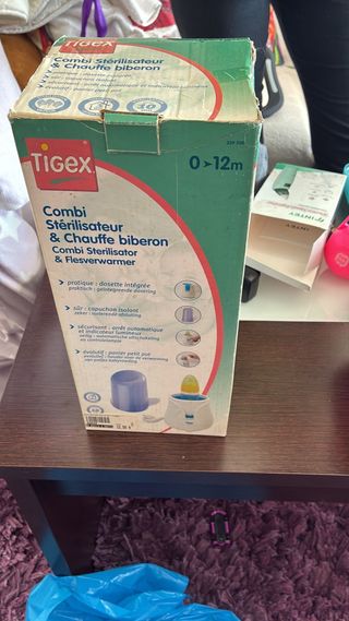 Esterilizador y calentador de biberones Tigex, modelo Combi. - Diseño práctico con dosificador integrado. - Capuchón aislante para mayor seguridad. - Parada automática e indicador luminoso. - Apto para cestas de pequeños potes de comida.