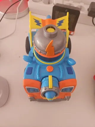 Vehículo de juguete Superthings con un diseño llamativo. - Colores principales: azul, naranja y amarillo. - Detalles en gris y azul claro. - Alas traseras amarillas con detalles azules. Los 3 25 e.