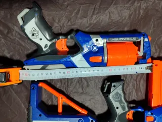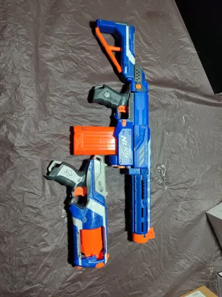 Se venden dos pistolas Nerf, la Retaliator y la Strongarm, en color azul y naranja. - Pistola Nerf Retaliator. - Pistola Nerf Strongarm. - Cargador naranja incluido.
