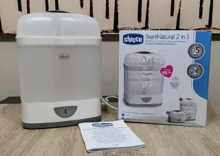 Esterilizador eléctrico Chicco SterilNatural 2 en 1. - Elimina el 99.9% de los gérmenes domésticos nocivos. - Esterilización rápida en 5 minutos. - Protección de hasta 24 horas. - Diseño modular y ajustable.