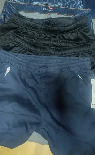 Conjunto de ropa infantil talla 164 a 170 que incluye pantalones vaqueros y deportivos. Los vaqueros tienen 1-a 3 puestas ya q no le gustan los vaqueros y uno de ellos nuevo - Pantalones vaqueros con etiqueta nuevo 'KIDS'. - Pantalones deportivos negros. - Pantalones tipo jogger azul marino.