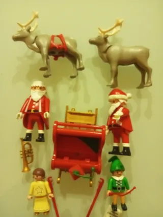 Set de figuras de Playmobil con temática navideña. - Incluye dos figuras de Papá Noel. - Dos figuras de renos. - Un trineo rojo. - Un elfo. - Una figura infantil. - Accesorios como trompeta y bastones.