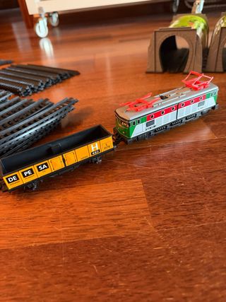 Tren eléctrico a pilas con vagón de carga. Juguete de cuando yo era pequeño. Incluye: - 70 vías curvas largas - 16 rectas - 5 intercambiadores - 2 encarriladores - 2 estaciones - 2 tuneles - 1 maquina - 1 vagon