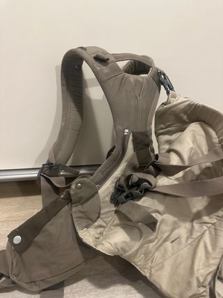 Mochila ergonómica para llevar a tu bebé de forma cómoda y segura. - Color beige y marrón. - Marca STOKKE.