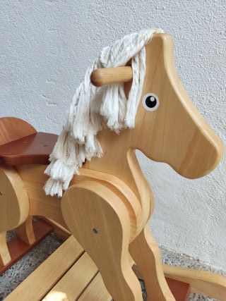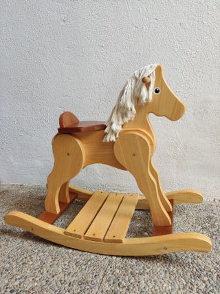 Caballo balancín de madera maciza de calidad, muy robusto y prácticamente nuevo. Valorado en 180€.