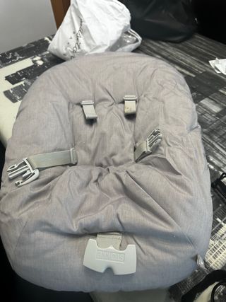 Hamaca gris para trona Stokke Tripp Trapp. Se adapta al asiento para mayor comodidad. Muy poco uso y en perfecto estado - Tejido suave y acolchado. - Incluye arnés de seguridad. - Cierre con hebilla. - Marca Stokke visible.
