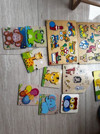 Set de puzzles de madera con divertidos diseños de animales y vehículos. - Puzzles de animales: mono, rana, jirafa, tigre, mariposa, elefante, búho. - Puzzles de vehículos: trenes, camiones, coches. - Fabricados en madera resistente.