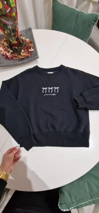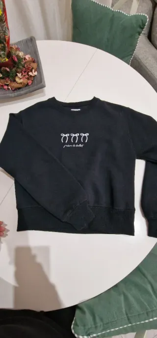 Jersey negro de Zara con un diseño de tres lazos blancos bordados en la parte delantera. - Manga larga. - Cuello redondo. - Puños y bajo elásticos.