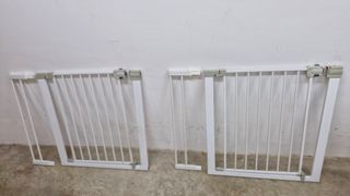 Se venden dos puertas de seguridad, ideales para bloquear pasillos o escaleras a bebés o mascotas. Incluyen todos los accesorios necesarios para su instalación y kit de extensión para puertas más grandes. La puerta hace 70cm y con el kit de extensión y los tensores de sujeción puedes llegar hasta los 90cm o algo más. - Color blanco. - Estructura metálica. - Diseño de barrotes verticales. - Configurable para apertura a ambos lados (hacia adetro o hacia afuera) - Cierre de seguridad para niños Vendo las dos puertas juntas (no por separado) y no hago envíos (entrega en Altafulla).