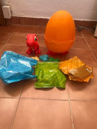Un huevo de dinosaurio Smashers de color naranja. Incluye un dinosaurio rojo y accesorios. - Huevo de plástico naranja. - Dinosaurio rojo. - Accesorios de dinosaurio.