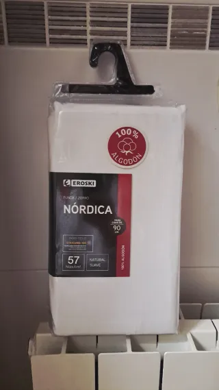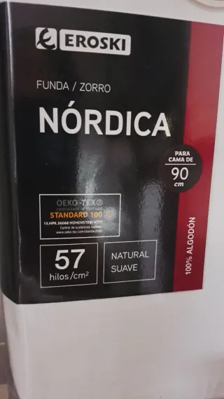 Funda nórdica nueva de la marca Eroski, ideal para cama de 90 cm. - Material: 100% Algodón. - Certificación OEKO-TEX Standard 100. - Hilos por cm²: 57. - Tacto natural y suave.