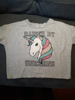 Sudadera gris para niña con un divertido estampado de unicornio. - Dibujo de unicornio con Raised by Unicorns. - Diseño con cuello redondo y manga corta. - Bajo deshilachado.