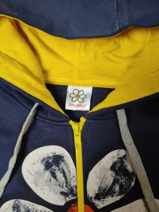 Sudadera azul marino con cremallera frontal y forro interior amarillo. - Diseño de flor blanca con centro naranja en el pecho. - Detalle de letras amarillas en la manga. - Capucha con cordones.
