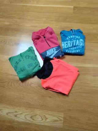 Lote de cuatro sudaderas para niño en talla 10. Incluye prendas de diferentes colores y marcas. 15 euros el lote. - Sudadera verde con texto BENETTON 1965. - Sudadera ROJA NIKE AIR con cremallera y logo Nike. - Sudadera azul con texto GENUINE HERITAGE. MAYORAL - Sudadera naranja con detalles NEGROS. ZARA