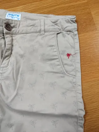 Pantalón corto de niño de la marca Mayoral, talla 8 años. Con un divertido estampado de palmeras. - Color beige. - Estampado de palmeras. - Cierre de botón y cremallera.