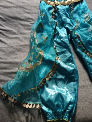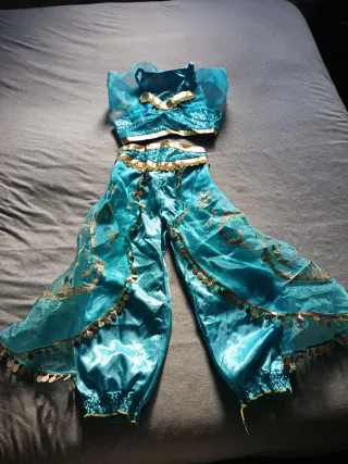 Disfraz de la Princesa Jasmine de Disney, talla 130cm. - Conjunto de dos piezas: top y pantalón. - Diseño inspirado en el personaje. - Tejido ligero y vaporoso. - Detalles dorados y lentejuelas.
