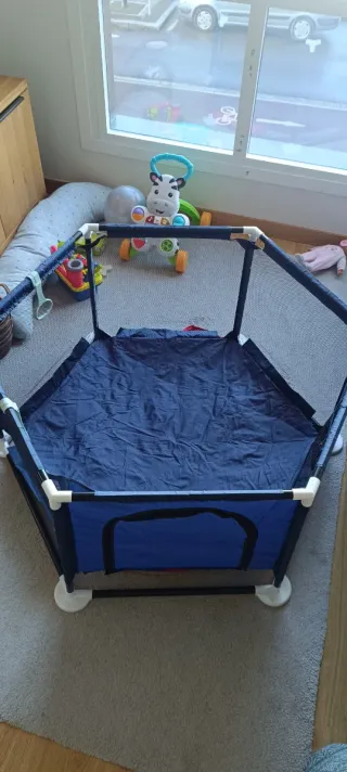 Parque de juegos hexagonal para bebés, ideal para crear un espacio seguro. Se puede utilizar como chiquipark. - Sin estrenar. - Estructura resistente. - Base de tela azul. - Malla en los laterales. - Acolchado para poner en la parte inferior - Muy fácil de montar.