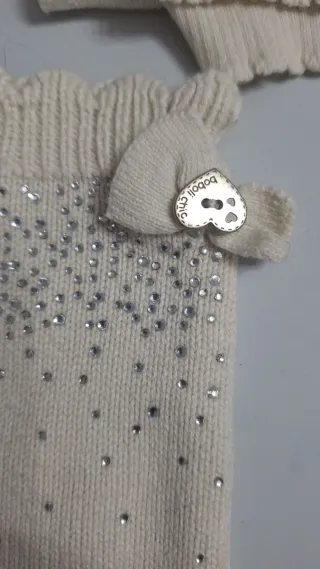 Conjunto de guantes y bufanda para niña de la marca Boboli. - Talla M. - Color blanco roto. - Detalle de brillantes y lazo con corazón en la bufanda. - Puños de los guantes con volantes y detalle de brillantes y lazo con corazón.
