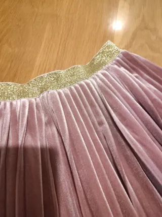 Preciosa falda de terciopelo para niña. Completamente nueva. Es plisada y tiene mucha caída y vuelo. Talla 4 aunque viste un poco grande. - Color rosa palo. - Talla 4. - Cintura elástica con detalle dorado.