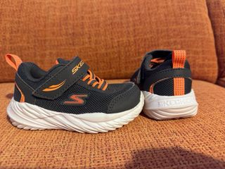Zapatillas deportivas Skechers para niño. - Color azul marino y naranja. - Cierre de velcro. - Suela blanca.