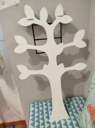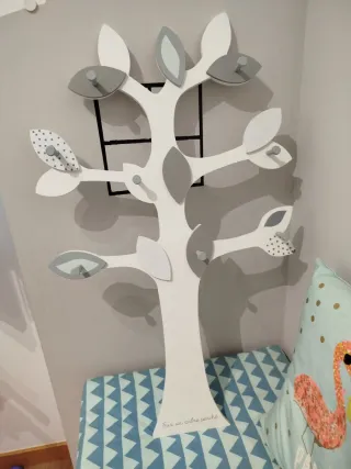 Original perchero de la mansions du monde con forma de árbol, ideal para habitaciones infantiles. Su diseño blanco y gris le da un toque moderno y divertido. - Estructura en forma de árbol. - Hojas decorativas en blanco y gris. - Puntos de enganche integrados en las ramas. Está en buen estado. Solo tiene los pequeños defectos que se ven en las fotos.