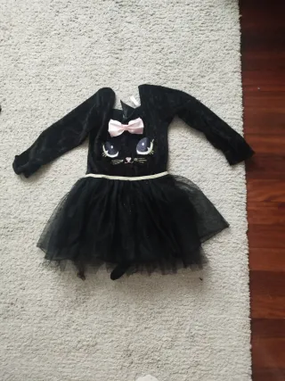 Adorable disfraz de gatita para niña, perfecto para fiestas o Halloween. - Color negro. - Detalle de lazo rosa en el cuello. - Falda de tul. - Estampado de cara de gatita en el pecho.
