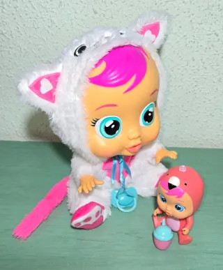 Set de dos muñecos Bebés Llorones. - Muñeco grande bebé llorón Daisy con traje de gato blanco y rosa. Funciona con pilas (nuevas incluidas) y llora de verdad. - Muñeco pequeño con traje de flamenco rosa. Funciona sin pilas y llora al apretar su cabeza. - Incluye accesorios como biberón y chupete.