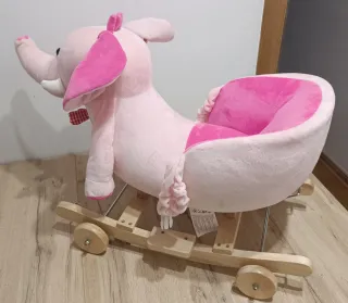 Elefante balancín de peluche rosa con base de madera y ruedas. - Peluche suave. - Base de madera. - Ruedas para movimiento. - Con sonido