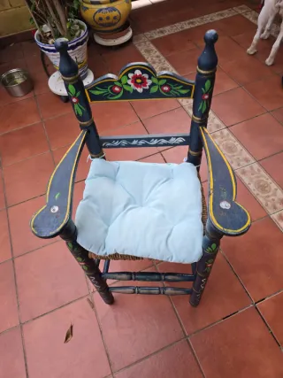 Silla trona antigua de madera, ideal para niños. Presenta un diseño pintado a mano con motivos florales. PARA RESTAURAR UN POCO POR EL USO - Estructura de madera pintada en azul. - Asiento de esparto. - Cojín acolchado de color claro. - Detalles pintados a mano en respaldo y patas.
