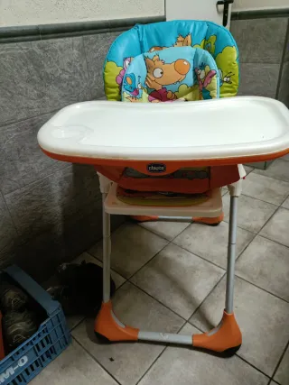 Trona para bebé de la marca Chicco, con un divertido diseño. - Asiento acolchado y lavable. - Bandeja extraíble. - Estructura resistente y segura. Usado con 4 niños, de ahi el desgaste pero sigue siendo igual de funcional y segura
