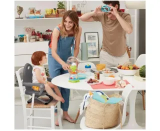 Elevador de silla portátil para niños de la marca Chicco. Ideal para llevarlo a cualquier lugar. - Diseño compacto y ligero. - Arnés de seguridad. - Estructura resistente.