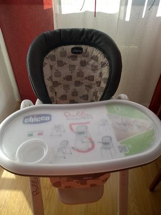 Trona para niña marca chicco varias posiciones 5 en 1 se puede poner a varias alturas y también como trona encima de la silla es reclinable y se puede plegarpara ocupar menor espacio. La esponja en la zona de las piernas está un poquito pelada tal y como se ve en las fotos por lo demás esta en perfecto estado . La compre en el corte inglés por 230€