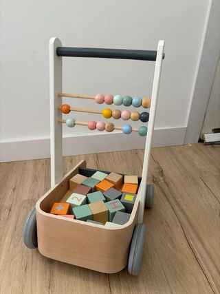 ¡Hola! Vendo este precioso carrito de madera multi-actividades de la prestigiosa marca Janod (colección Sweet Cocoon). Es el juguete ideal para acompañar a los más peques en sus primeros pasos de forma segura y divertida. Características principales: • Ayuda al caminar: Estructura de madera muy estable y robusta, diseñada para dar confianza al niño. • Actividades educativas: Incluye un ábaco con bolas de colores para desarrollar la motricidad fina. • Bloques de madera: Viene con un set de cubos con letras, números y formas geométricas para construir y aprender. • Diseño premium: Colores nórdicos suaves que quedan genial