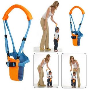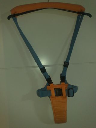 Andador para ayudar a los bebés a dar sus primeros pasos. Es un arnés de seguridad con asas para que el adulto pueda guiar al niño. - Color naranja y azul. - Material textil.