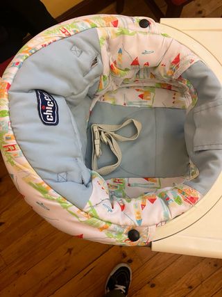 Trona Chicco de mesa que guita 360 grados para orientar al bebé en la dirección que se quiera. Tiene bolsa de transporte y libro de instrucciones. Fácil de poner y quitar. La funda se puede quitar para lavar.