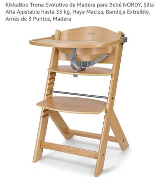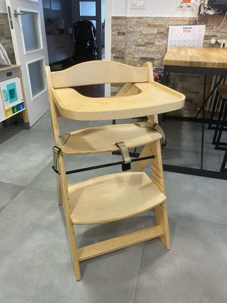 Trona evolutiva de madera maciza de haya, ideal para bebés. Se adapta al crecimiento del niño. - Bandeja extraíble. - Arnés de 3 puntos. - Ajustable hasta 35 kg. Muy poco uso, se entrega montada