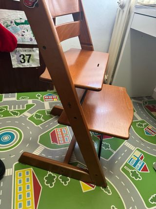 Silla de madera de la marca Stokke, modelo Trona. Perfecta para que los más pequeños coman y jueguen. - Fabricada en madera. - Diseño ergonómico y seguro. Presenta signos de uso normales (pequeños roces/marcas estéticas), y falta un tornillo pero es totalmente funcional, estable y cómoda. Ideal para acompañar el crecimiento del niño/a. Se puede ver sin compromiso.