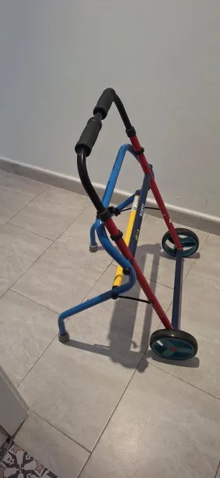 Andador de color azul, rojo y amarillo, diseñado para niños. Cuenta con dos ruedas delanteras para facilitar el desplazamiento. - Estructura metálica. - Mangos ergonómicos. - Ruedas delanteras.