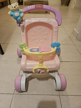 Andador para bebés de la marca Fisher-Price en color rosa. Cuenta con divertidos juguetes. - Diseño con osito y ranita. - Bandeja con sonajero. - Ruedas para facilitar el movimiento. Fisher Price Andador Cochecito de muñecas bebés +1 año (Mattel M9523) Cochecito de juguete que sirve de andador para los primeros pasos del niño. Suena música mientras el niño anda o al apretarle la barriguita al oso. Actividades divertidas: cilindros, ruedecitas y libro. Cochecito muy real que fomenta el juego de imitación.