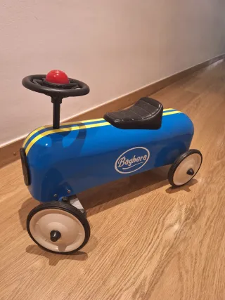 Algunas marcas de uso. Ver fotos. El correpasillos andador Racer Azul Baghera es un coche de carreras para pequeños conductores. Este andador correpasillos tiene movimiento real en la dirección así el niño comprenderá instintivamente cómo avanzar y girar. De este modo desarrolla su equilibrio y las habilidades motrices controlando rápidamente sus pies. Sus neumáticos de goma ayudarán a mantenerlo estable. Peso: 4,5 Kg. Materiales del chasis: Metal. Material del asiento: Plástico. Material de las ruedas: Metal con banda de goma. Longitud: 58 cm. Anchura 34 cm. Altura. 38 cm.