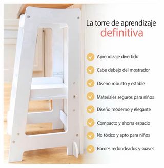 Torre de aprendizaje tipo Montessori, ideal para que los niños participen en actividades en la cocina o en el hogar. - Fácil de montar, se arma en 10 minutos con llave Allen incluida. - Empaque plano para un transporte cómodo. - Altura total de 85cm. - Ancho y profundidad de 42cm. - Tres niveles de altura ajustables: 45cm (arriba), 38cm (medio) y 32cm (abajo), adecuados para edades de 18 a 48 meses.