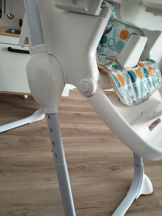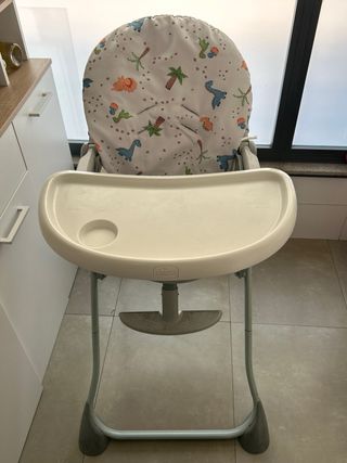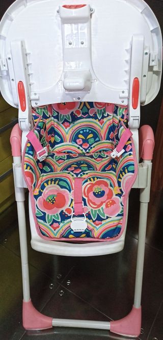 Trona Chicco usada por dos niños. Con funda nueva, ya que la original está dañada. - Estructura de plástico resistente. - Cojín acolchado. - Plegable para fácil almacenamiento.