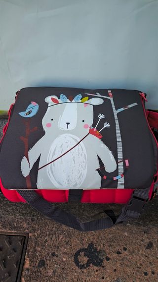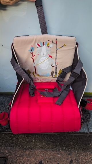 Asiento elevador para niñ@s Olmitos, plegable y fácil de transportar. Ideal para que el pequeñ@ coma a la altura de la mesa. - Diseño divertido con bolsillo para guardar baberos, juguetes, etc. - Arnés de seguridad. - Ligero (730 gr) y con asa regulable para el transporte. - Se adapta a la mayoría de sillas.