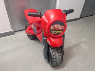 Moto de juguete para niños con diseño de Rayo McQueen de Cars. - Color rojo brillante. - Pegatinas temáticas de Cars. - Ruedas resistentes para jugar. Tiene un botón con sonido. Está prácticamente nuevo. Lo blanco es del suelo del pasillo del trastero,se quita con un trapo. La altura es para niños entre 2 años y 4.