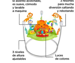 Usa este saltador solo con niñas y niños que sepan mantener la cabeza erguida por sí solos y que no sepan andar ni salir solos del asiento. Habilidades sensoriales: Las luces, los sonidos y las distintas texturas estimulan los sentidos del bebé. Motricidad gruesa: Fortalece la motricidad gruesa de los bebés al saltar, mantener el equilibrio con los dedos de los pies y estirar los brazos para interactuar con las actividades del saltador. Curiosidad y descubrimiento: actividades llenas de sorpresas que estimulan la curiosidad y las ganas de explorar de los niños.