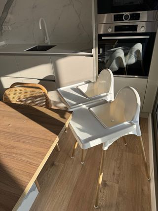 Trona ikea, patas modificadas y mas cortas para que entre debajo de la mesa y moleste menos, tambien mas comodo para los niños si quieren comer directamente en la mesa. Una puede ir con cojines. El precio es por cada una (tengo 2)